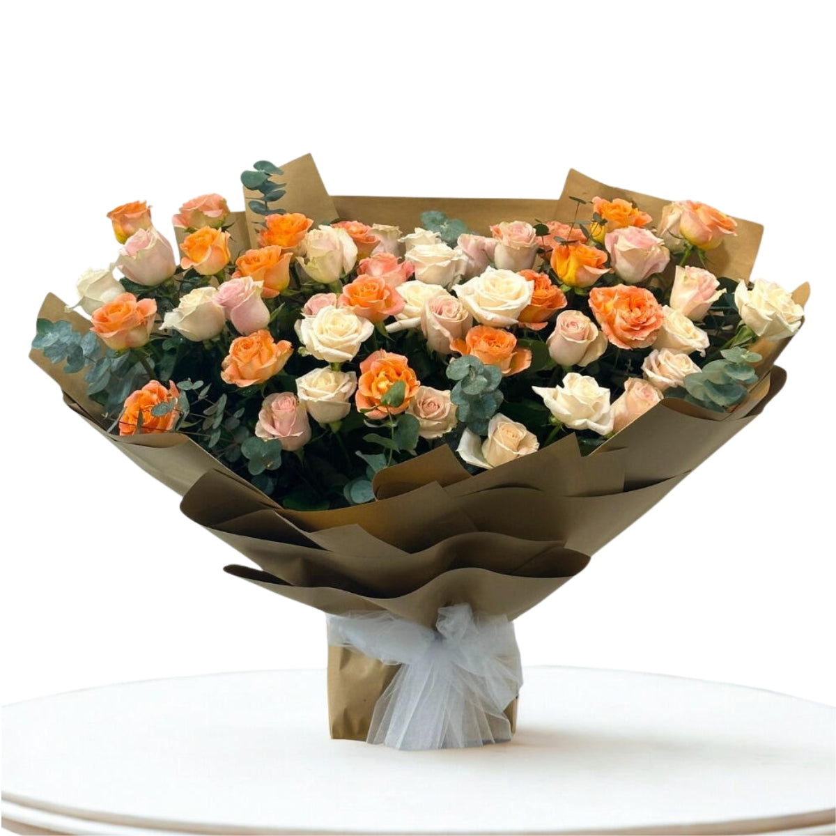 This exquisite combination of light pink , orange & white roses makes it the ideal bouquet for Valentines, Anniversaries, celebrations, or to simply express heartfelt emotions.