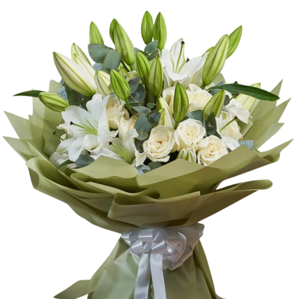 White roses with White Lilies have a special significance and are the ultimate floral expression of innocence, purity, sympathy and spirituality. They evoke sensations of serenity and peace in anyone who gazes upon them.